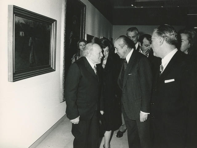 Carlos Arias Navarro, a quien acompaña el Ministro de Educación y Ciencia, Cruz Martínez Esteruelas, en la inauguración de la exposición del pintor Nicanor Piñole