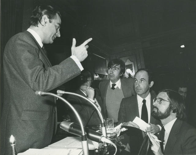 El Presidente del Congreso de los Diputados, Landelino Lavilla, conversa con los diputados Sole Tura, Ernest Lluch, Miguel Roca y Marcos Vizcaya