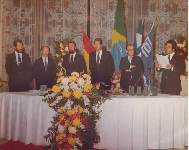 El Sr. Ministro de Trabajo y a su derecha el Sr. Director del SEE, el Sr. Cónsul de España y el Sr. Secretario de la Oficina del Sr. Ministro. A la izquierda el Sr. Amoedo Parada representando la colonia y el Sr. Agregado Laboral, en el acto de imponer las condecoraciones