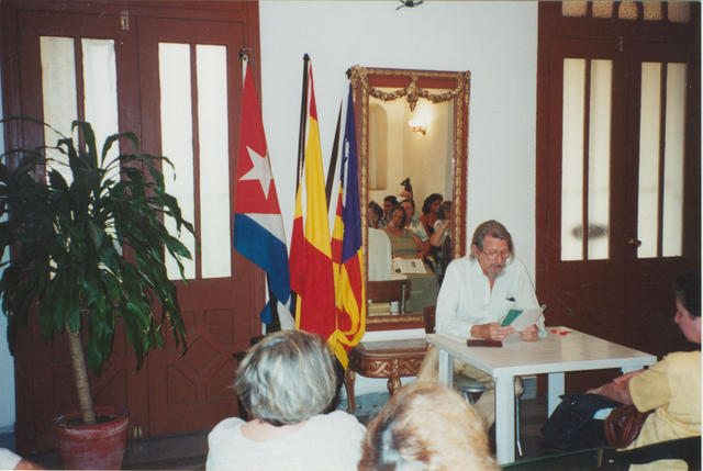 Fotografía de un hombre durante su intervención en un acto cultural en un Centro Español en Cuba