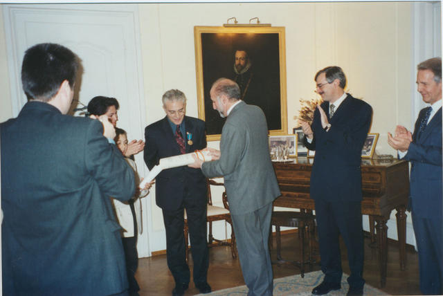 Antonio Maceda, Secretario General de Ordenación de las Migraciones, entregando un diplomas