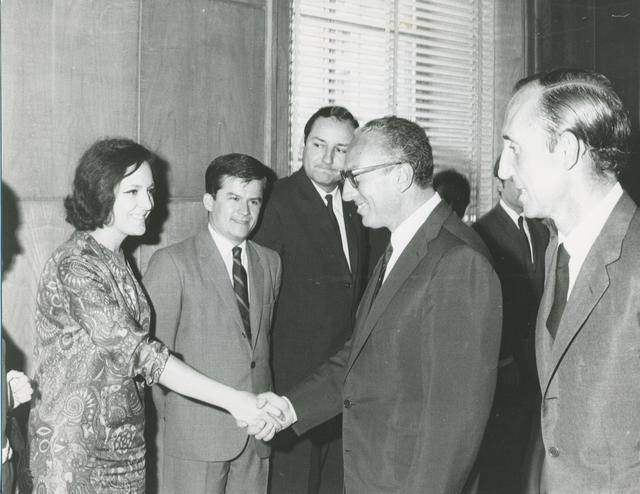 Un centenar de becarios licenciados universitarios, hijos de españoles residentes en Hispanoamérica, han visitado al Ministro de Trabajo acompañados del Director General del Instituto Español de Emigración, Sr. García de Sáenz.