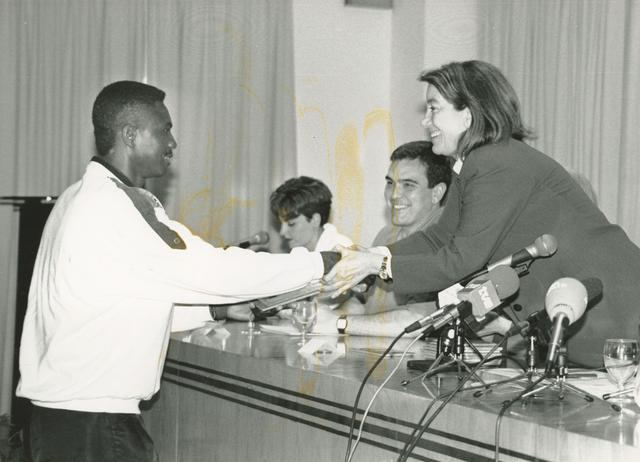 Cristina Alberdi saluda a un inmigrante