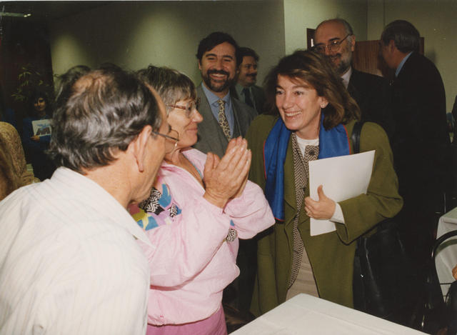 La Ministra saluda al grupo de emigrantes españoles con los que se ha reunido