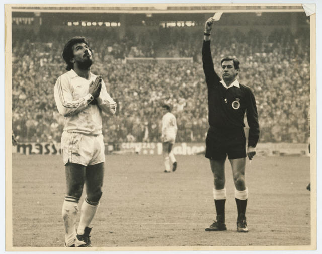 El jugador del Real Madrid, Juanito, en el momento de ser sancionado por pisar al jugador del Bayern de Munich durante el partido entre ambos equipos disputado en Alemania.