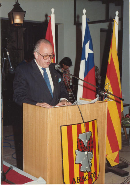 Discurso del Presidente de la Colectividad Aragonesa de Chile, don Ramón Gimeno Iglesias en el Estadio Español de Santiago durante la Fiesta Mayor de 1989