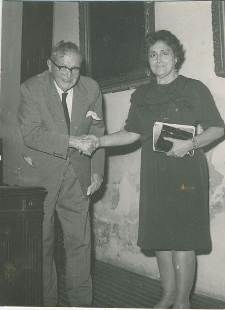 El Dr. José María Chacón y Calvo, Presidente del Ateneo de La Habana, felicitando a la poetisa Sra. Mercedes Álvarez Becerra, por la lectura de sus poemas el 16 de marzo de 1968