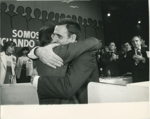 El nuevo presidente de UCD es felicitado por Adolfo Suárez. - Archivo Gráfico de Carta de España