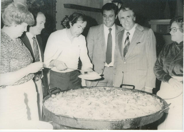 El Padre José Luis Ocejo, organista del Santuario de la Virgen Bien Aparecida, patrona de la Montaña, que es fundador y director de la Coral Salvé de Laredo, sirve un plaro de paella valenciana en presencia del Vicecónsul de España, Don Fernando García Navarro y del señor Guillermo Martí, presidente de la U. R. Valenciana.
