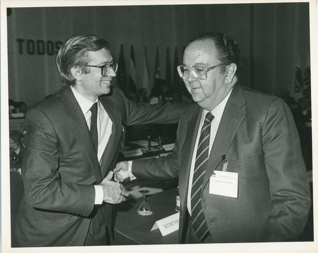 El Presidente del PDP, Óscar Alzaga, saluda a Inigo Cavero, al comienzo del III Congreso Nacional del partido.