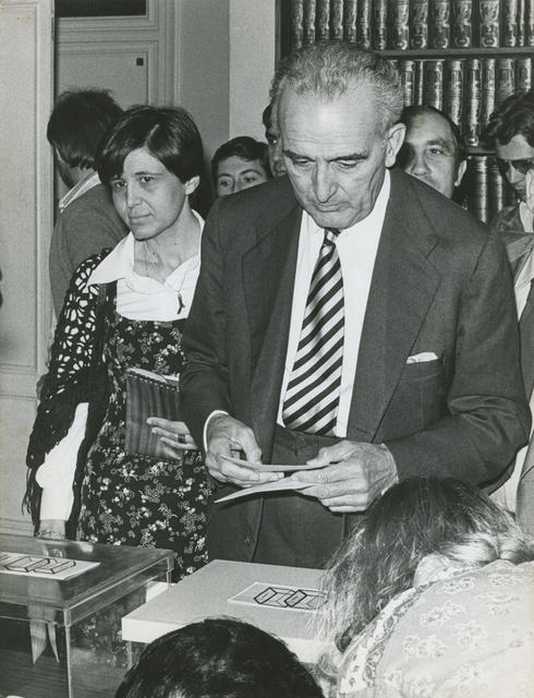 El líder de Izquierda Democrática, Joaquín Ruiz Giménez, en el momento de entregar sus sobres al presidente de la mesa electorla