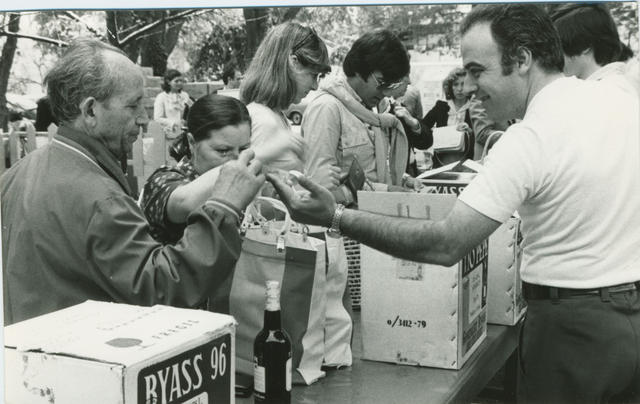 1979, personas recogiendo vinos y alimentos.