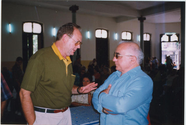 Dos hombres hablando en una reunión.