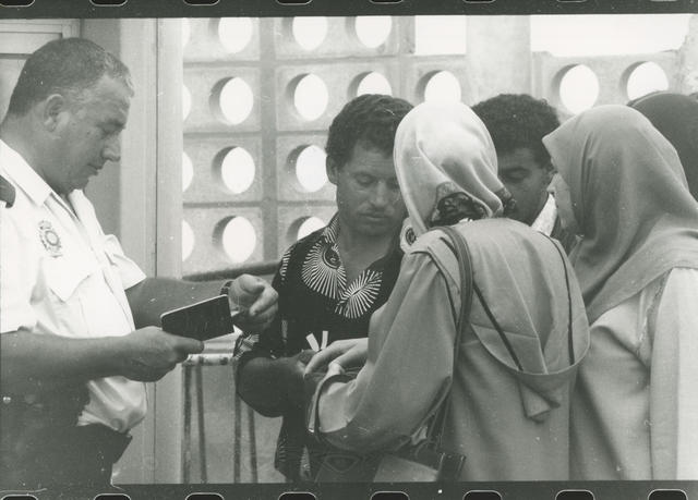 Un policía revisa los pasaportes de unas mujeres que quieren cruzar la frontera