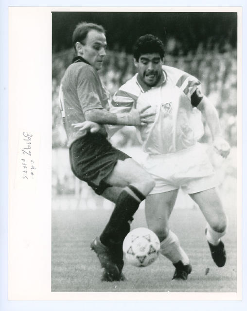 Diego Maradona, del Sevilla, controla un balón ante la oposición de Martín González del Osasuna, durante el partido jugado en el Sánchez Pizjuán por estos dos equipos