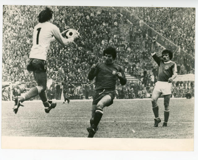 El meta de la selección nacional de fútbol de Yugoslavia, Katalinic, se hace con un balón ante la presencia del español Juanito.
