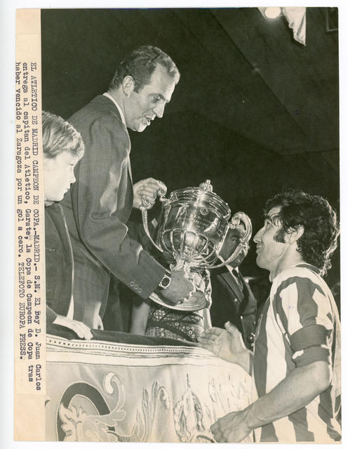 El rey don Juan Carlos entrega al capitán del Atlético de Madrid, Garate, la Copa de Campeón de Copa tras haber vencido al Zaragoza por un gol a cero.