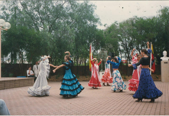 Grupo de danzas del Club Español de Sydney actuando en el acto de Inauguración de la plaza Iberoamericana de Sydney con la estatua del navegante Fernández de Quirós al fondo
