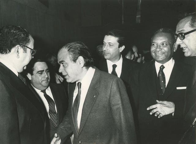 Cavero, Jordi Puyol, Mayor Zaragoza (Subdirector de la UNESCO), M. Brown (Director General de la UNESCO) y Solano (Embajador de España en Francia)