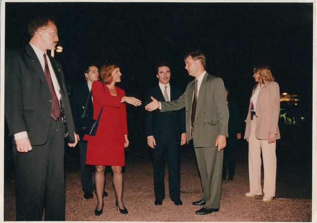 Jefe del Gobierno español José María Aznar junto a su esposa Ana Botella saludando al director del Colegio Cervantes