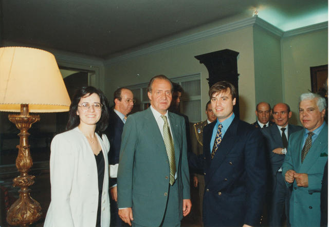 Juan Carlos I Rey de España flanqueado por don Carlos Cambón y su señora esposa en ocasión de la última visita de sus Majestades a Uruguay