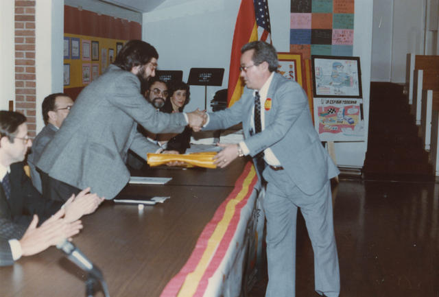 Diputado del Congreso, D. Juan Colinos, entregando al Presidente de la Asociación de Españoles en Washington
