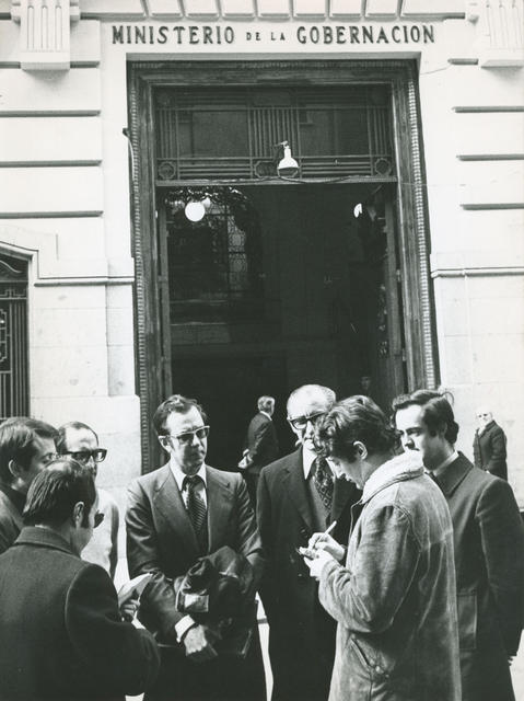 Raul Morodo, José Bono, Jorge Enjto y Donato Fueyo del Partido Socialista Popular (PSP) en el Ministerio de Gobernación para presentar la documentación necesaria para legalizar su partido