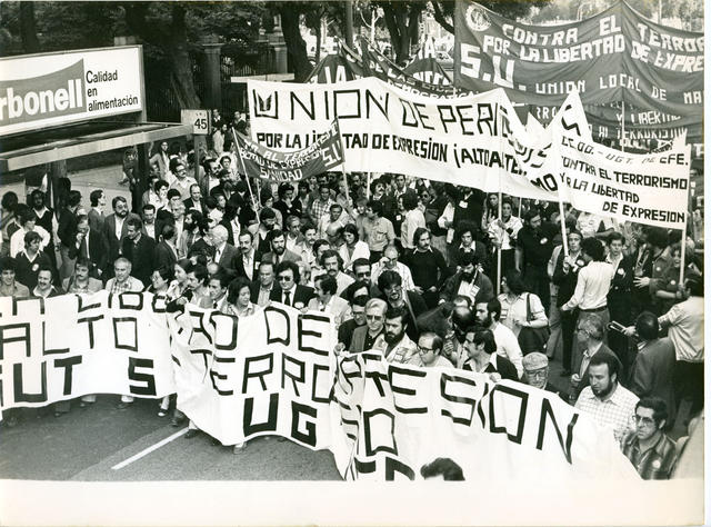 Un aspecto de la manifestación organizada por las centrales sindicales en apoyo de la libertad de expresión y como protesta por los últimos asesinatos en el País Vasco. Encabezaban la manifestación los principales líderes sindicales