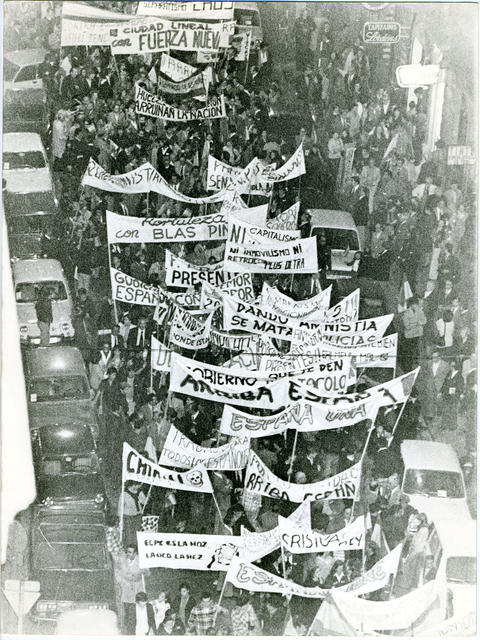 Numerosas pancartas con diversos textos, durante la manifestación celebrada en Madrid organizada por "Fuerza Nueva"