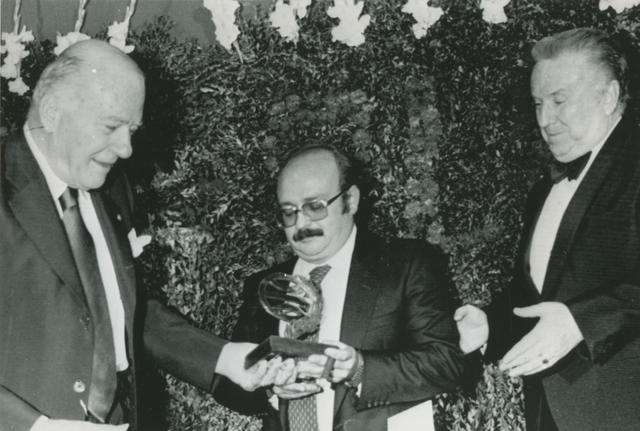 Manuel Vázquez Montalbán recibe el premio Planeta de manos del Presidente de la Generalitat de Cataluña, Josep Tarradellas, A su izquierda, el editor Lara