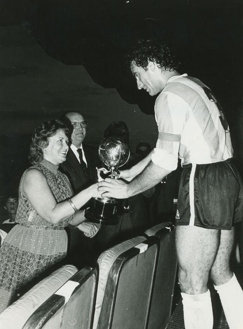 María Teresa Iza Echave, Directora General del Instituto Español de Emigración, entrega el trofeo del Mundialito de fútbol de 1983.