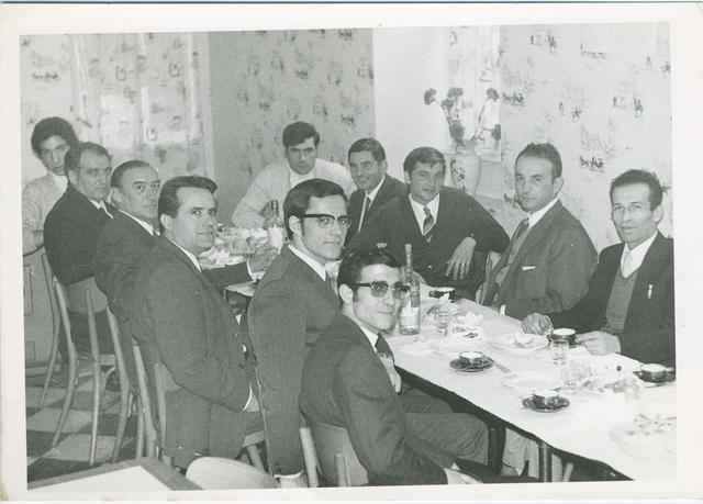 Miembros de la Junta Directiva de la Casa de España de Annonay y su Presidente Don José Castro, con el Cónsul de España en Nimes, Don Javier Rubio, y el Canciller de dicho Consulado, Don José Ibáñez, reunidos en un almuerzo que tuvo lugar con ocasión de la entrega del material cultural del Instituto Español de Emigración al referido centro, en abril de 1971