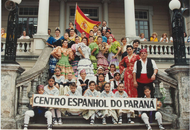 Los miembros del Centro Español de Paraná posan con la bandera de España y diferentes trajes regionales