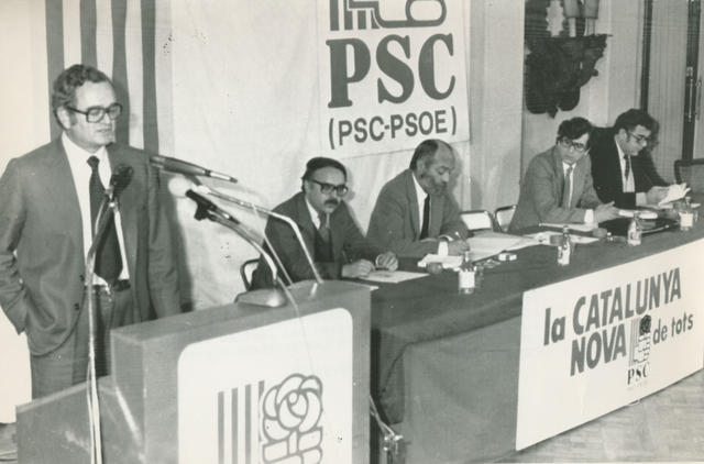 Los señores Raventos, Humet, Toval Flotas y Codina forman la mesa en el acto de presentación del programa y candidatos del Partido Socialista de Cataluña (PSC-PSOE) para las próximas elecciones al Parlamento Catalán