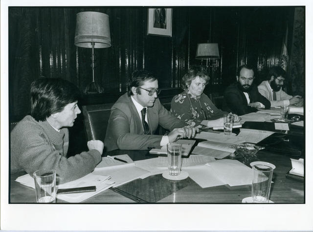 De izquierda a derecha: María Luz Rufilanchas, Movimientos Migratorios; Javier Casas, Subdirector del Instituto Español de Emigración; María Teresa Iza Echave, Directora General del Instituto Español de Emigración; Rodrigo García Conde, Agregado Laboral en Suiza y Antonio Capitán, de la Agregaduría. Marzo 1983