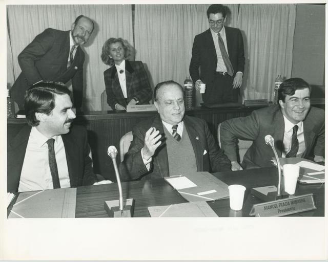 José María Aznar, Manuel Fraga y Francisco Álvarez Cascos, durante la reunión de la Junta Directiva del Partido Popular para analizar los resultados de las elecciones autonómicas gallegas.