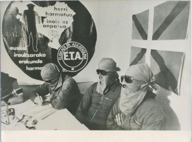 Tres etarras compadecen en rueda de prensa en lugar desconocido del País Vasco para anunciar que por el momento dejaban de poner bombas.