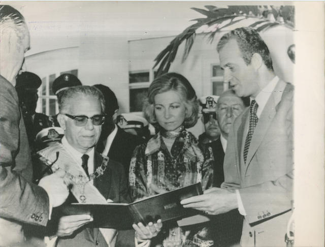 S.M. el Rey don Juan Carlos entrega al Presidente de la República Dominicana el "Libro del Gran Collar de Isabel la Católica" que luce éste en el pecho en el transcurso de un acto celebrado en la Embajada de España. En el centro, S.M. la Reina Doña Sofía y el Ministro de Asuntos Exteriores Sr. Areilza