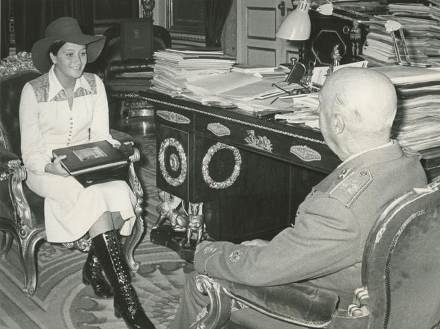 Instantánea de Francisco Franco durante una audiencia concedida en el Palacio del Pardo a Rafael Puig Llivina, Procurador en Cortes, acompañado de la señorita Noelia Alfonso Cabrera, "Miss Europa 1970"