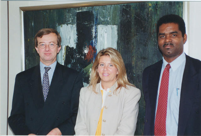 La Directora General de Ordenación de las Migraciones, Ángeles Muñoz Uriol, junto al Director General de Administración Pública del Ministerio Holandés del Interior, Sr. J. W. Holtslag, y el Director de Coordinación Política de Integración de Minorías del Ministerio del Interior, Sr. H. K. Fernandes Mendes, en la reunión para tratar, entre otros, temas relativos a los españoles de la primera generación en Holanda y posible aplicación a los mismos de la normativa holandesa de reemigración primada