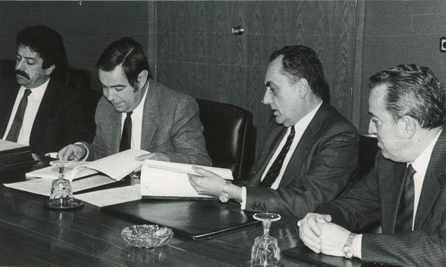 Instantánea del director general de Trabajo, Francisco García Zapata, en el acto de entrega al presidente de RENFE, Ramón Boixadós Malé, del Estudio sobre Rendimientos de los Talleres Centrales de Reparación de la Red