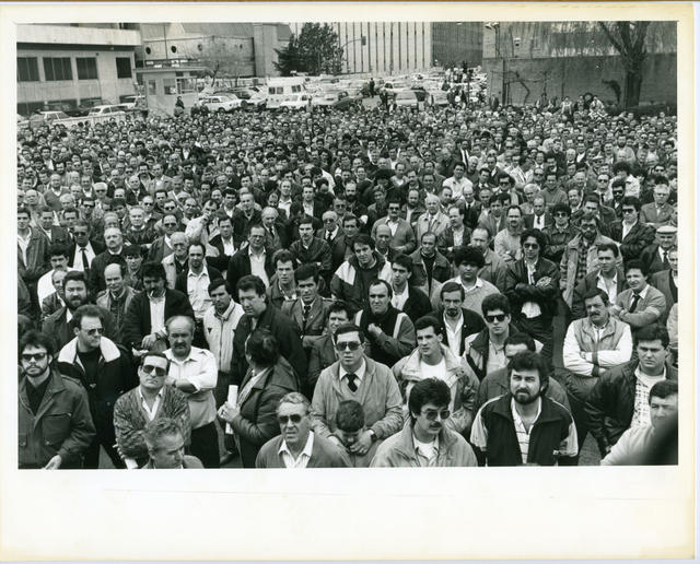 Los trabajadores de la EMT, que prosiguen la huelga indefinida, en apoyo de sus demandas de negociación con la empresa, durante la asamblea en las cocheras de Fuencarral