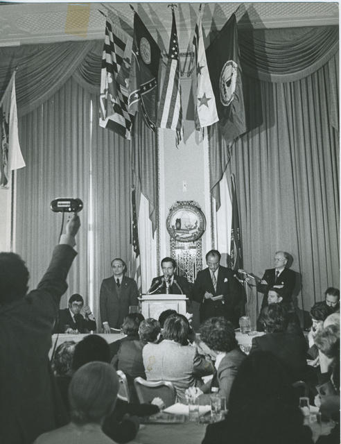 El Presidente del Gobierno Español Adolfo Suárez durante su conferencia de prensa en el Club Nacional de Prensa de Washington al finalizar su estancia en los Estados Unidos