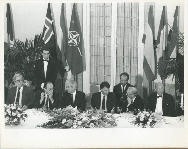 Cena celebrada en el Palacio de El Pardo, ofrecida por el Gobierno español a los participantes en la Conferencia de Primavera de la OTAN. De izquierda a derecha: Sir Geoffrey Howe, Ministro de Asuntos Exteriores de Gran Bretaña; Hans Dietrich Genscher, de Alemania; J. Poos, de Luxemburgo; Felipe González, Presidente del Gobierno; Lord Carrington, Secretario General de la OTAN; y George Shultz, Secretario de Estados de los Estados Unidos
