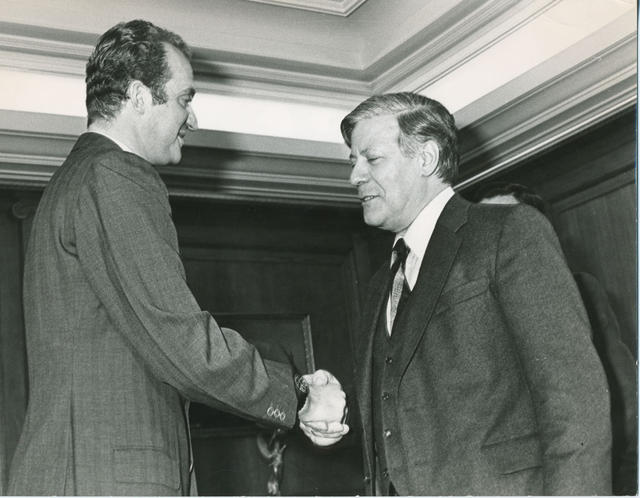 El Rey de España recibe en el Palacio de la Zarzuela al Canciller de Alemania, Helmut Schmidt, con quien mantuvo una entrevista