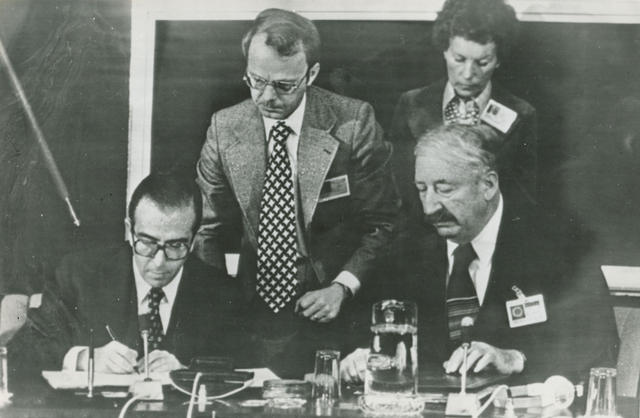 Marcelino Oreja, Ministro de Asuntos Exteriores, firmando la integración de España en el Consejo de Europa. A su derecha, Kahn-Ackerman
