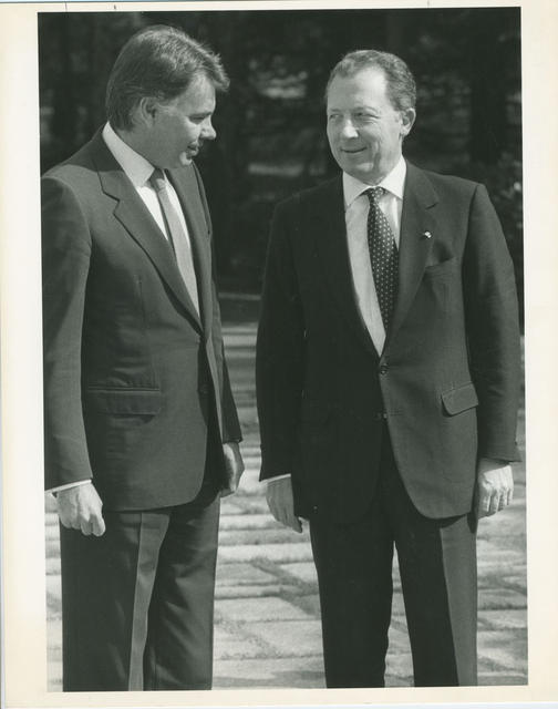 El Presidente del Gobierno, Felipe González, conversa con Jacques Delors, presidente de la Comisión Europea, poco antes de la entevista que ambos mantuvieron en el Palacio de la Moncloa, para tratar sobre los nombramientos de los comisarios españoles ante la Unión Europea