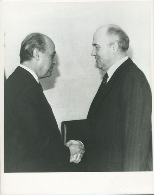 El Ministro de Asuntos Exteriores, Francisco Fernández Ordóñez, estrecha la mano del Presidente de la Unión Soviética, Mijail Gorbachov