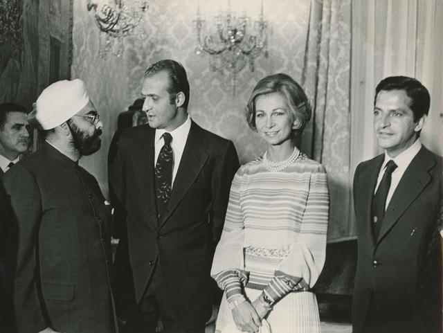Los Reyes charlan con el Presidente de la Unión Interparlamentaria, Sr. Dhillon, y con el Presidente del Gobierno, Adolfo Suárez