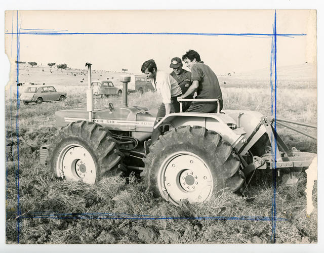 Instantánea del famoso matador Manuel Benítez "El cordobés", comprobando el funcionamiento de un tractor para su finca de Villalobillos.